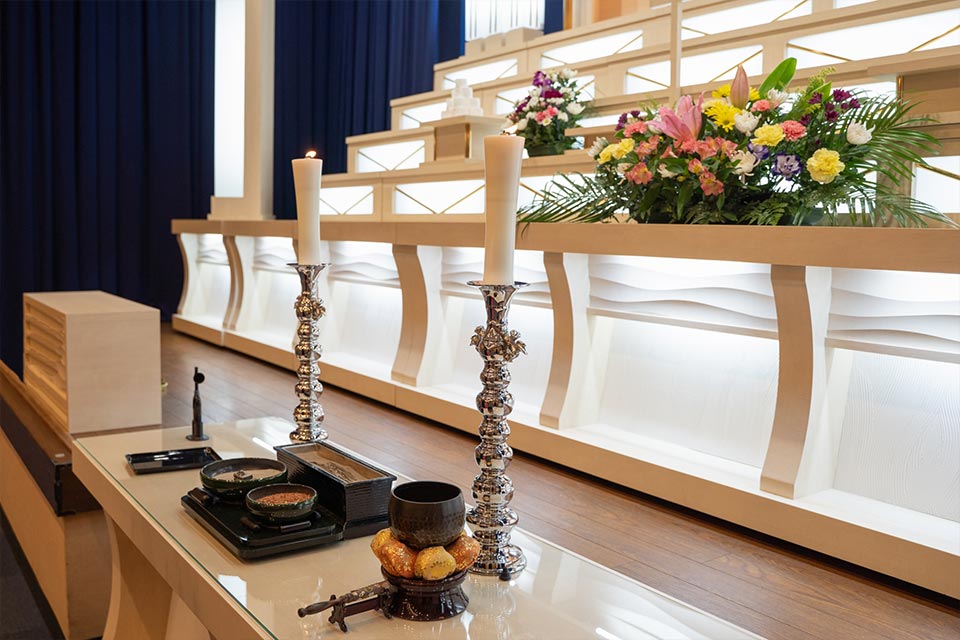 上尾伊奈斎場つつじ苑には、お見送りの規模に合わせて選べる3つの式場(60席・80席・150席)があります。家族葬から一般的なお葬式まで幅広く対応しており、仏式・神式・キリスト教式など、宗旨・宗派に合わせた祭壇もあらかじめ完備されています。